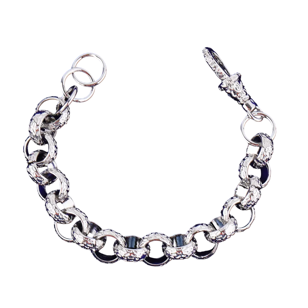 Elevate your style with our premium Metallic Mastery Textured Cuban Link Bracelet. This distinctive piece features a meticulously crafted design with uniquely textured links that create a seamless flow around your wrist, each adorned with intricate surface patterns that catch the light from every angle. The high-quality silver-toned finish ensures exceptional durability while maintaining a brilliant shine that creates striking contrast against any backdrop. Each link is precision-engineered for a perfect fit and comfortable wear, with decorated outer surfaces and smooth inner rings that demonstrate superior attention to detail. The textured surface adds depth and character to this bracelet, distinguishing it from ordinary Cuban chains and highlighting its artisanal craftsmanship. Perfect for both casual street style and more elevated occasions. Whether paired with other accessories or worn as a standalone statement, this textured Cuban link bracelet delivers a powerful statement. 100% satisfaction guaranteed. Shop OG, Stay OG.